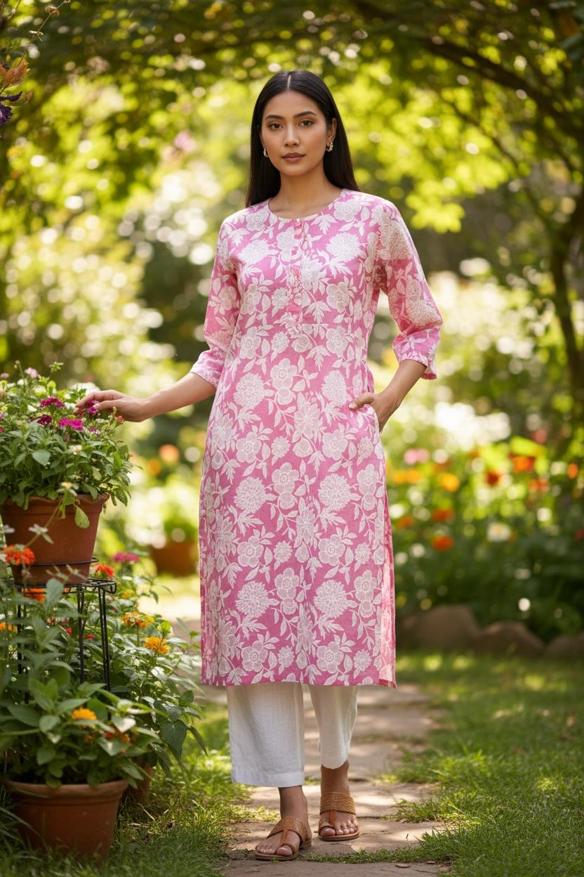 Pink floral cotton kurti